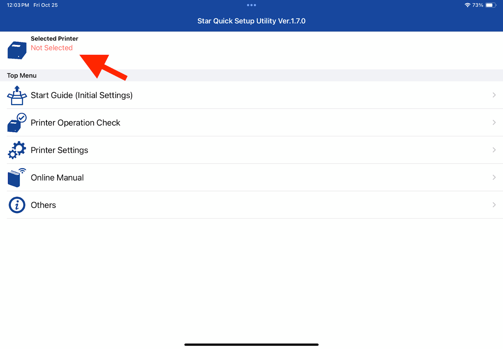 Once you select the printer you are connecting to, it will take you back to the home screen of the StarQuickSetup app.